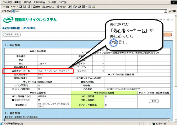 ART全部再資源化対象車の確認画面イメージ